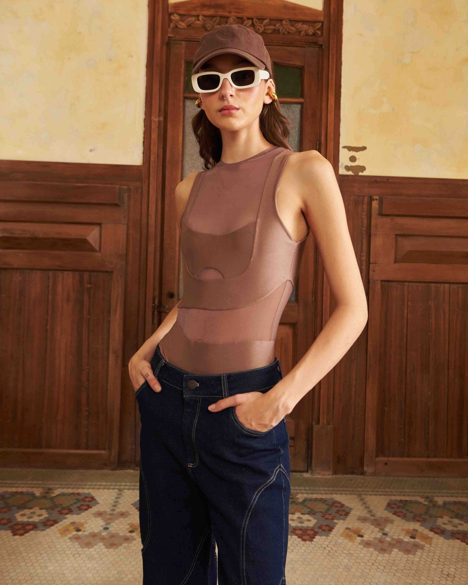 Body manga sisa con cortes asimétricos en mesh y tela con brillo, con broches en la parte inferior para mejor ajuste.