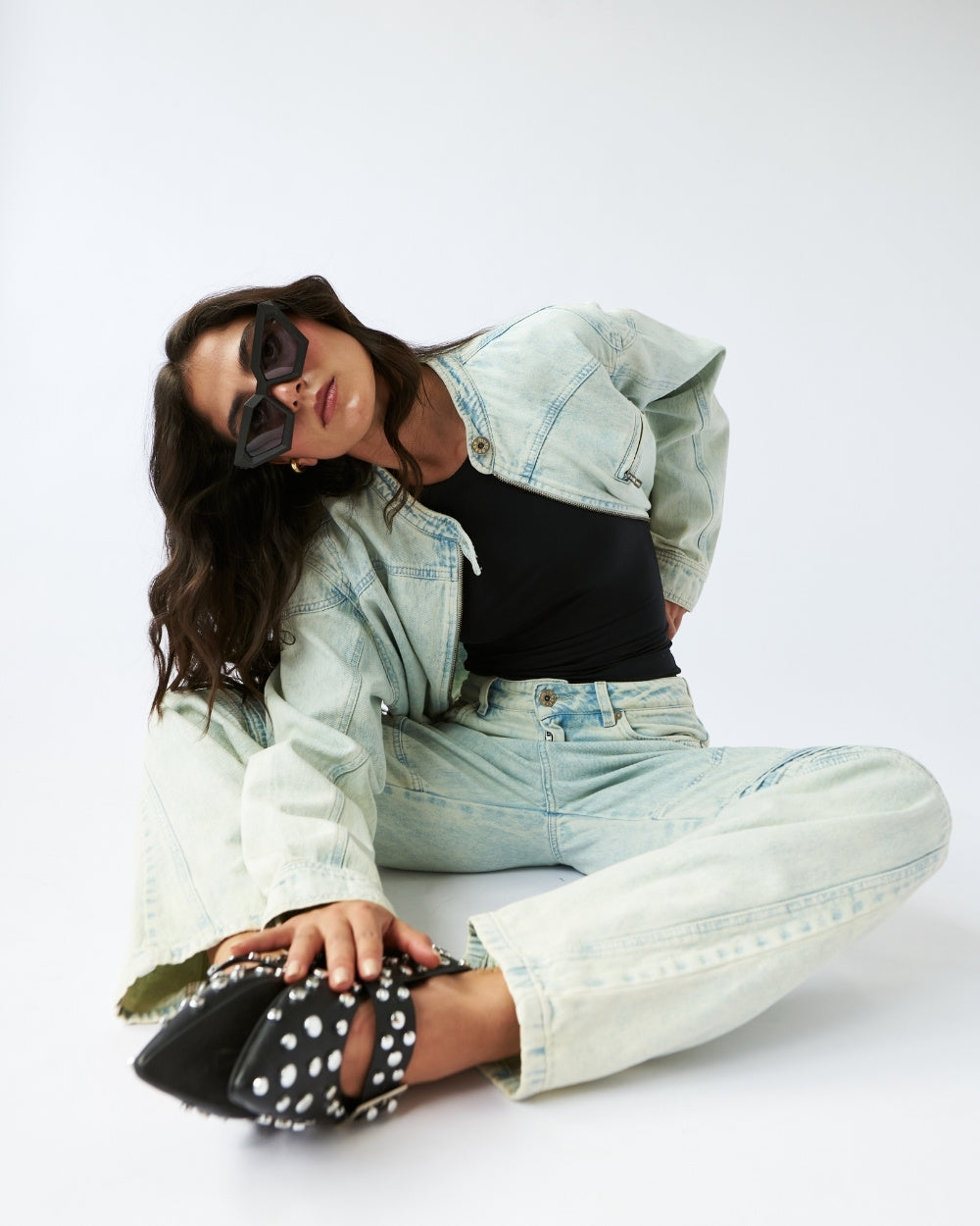Are you ready for a ride? Esta chaqueta con silueta motociclista, tiene cortes redondos en hombros y diagonales en frente; almilla delantera y posterior, bolsillo con cierre, cuello y cintura con solapa y botón. Pair it with the jeans for a total look—just saying…