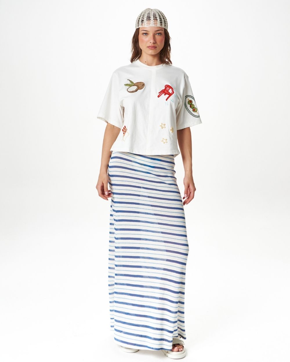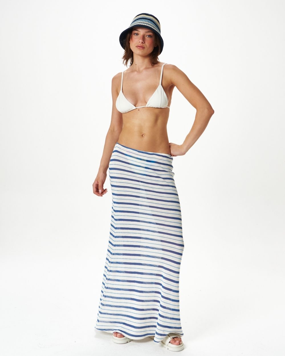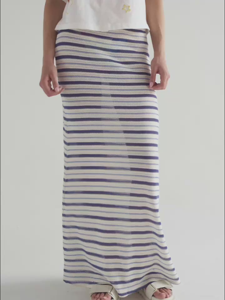 Warm days, easy skirt. Falda larga tejida, tiro bajo, con elástico en cintura para ajustar.