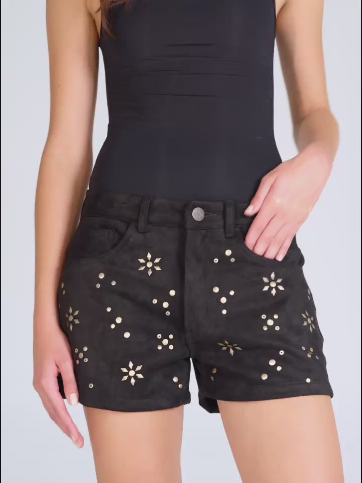 A little short never hurt. Short en gamuza, con apliques en frente y bolsillos en ambos lados.