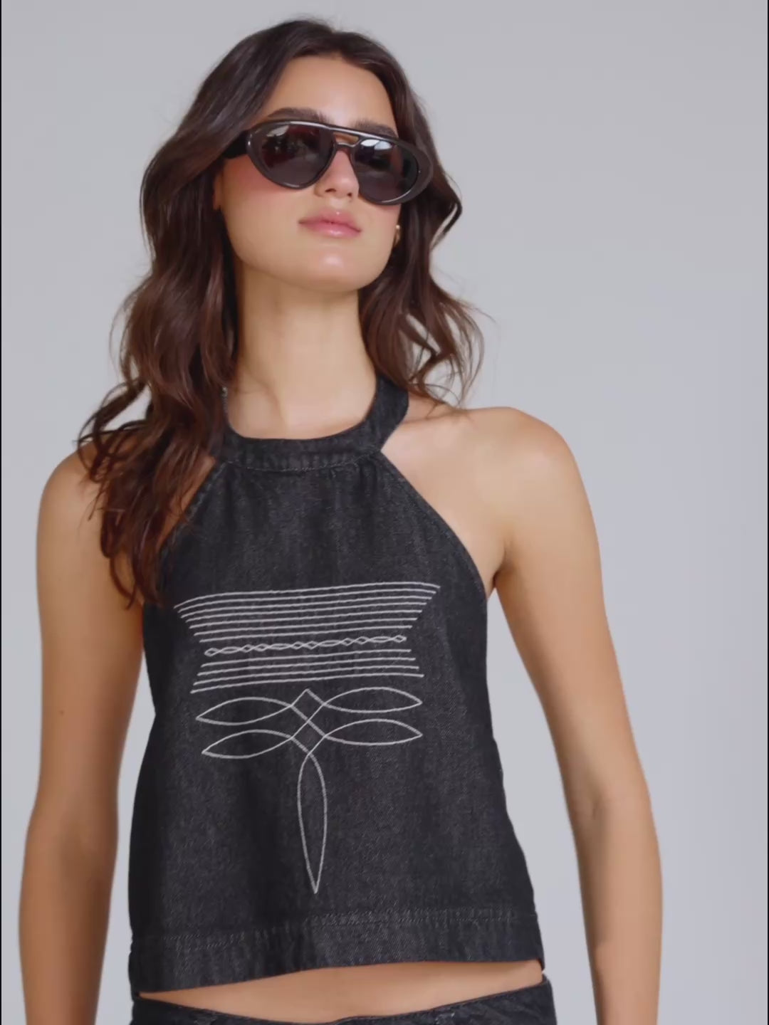 Y2K rodeo energy. Top en denim, ajustable en cuello y espalda, bordado en delantero y espalda descubierta.