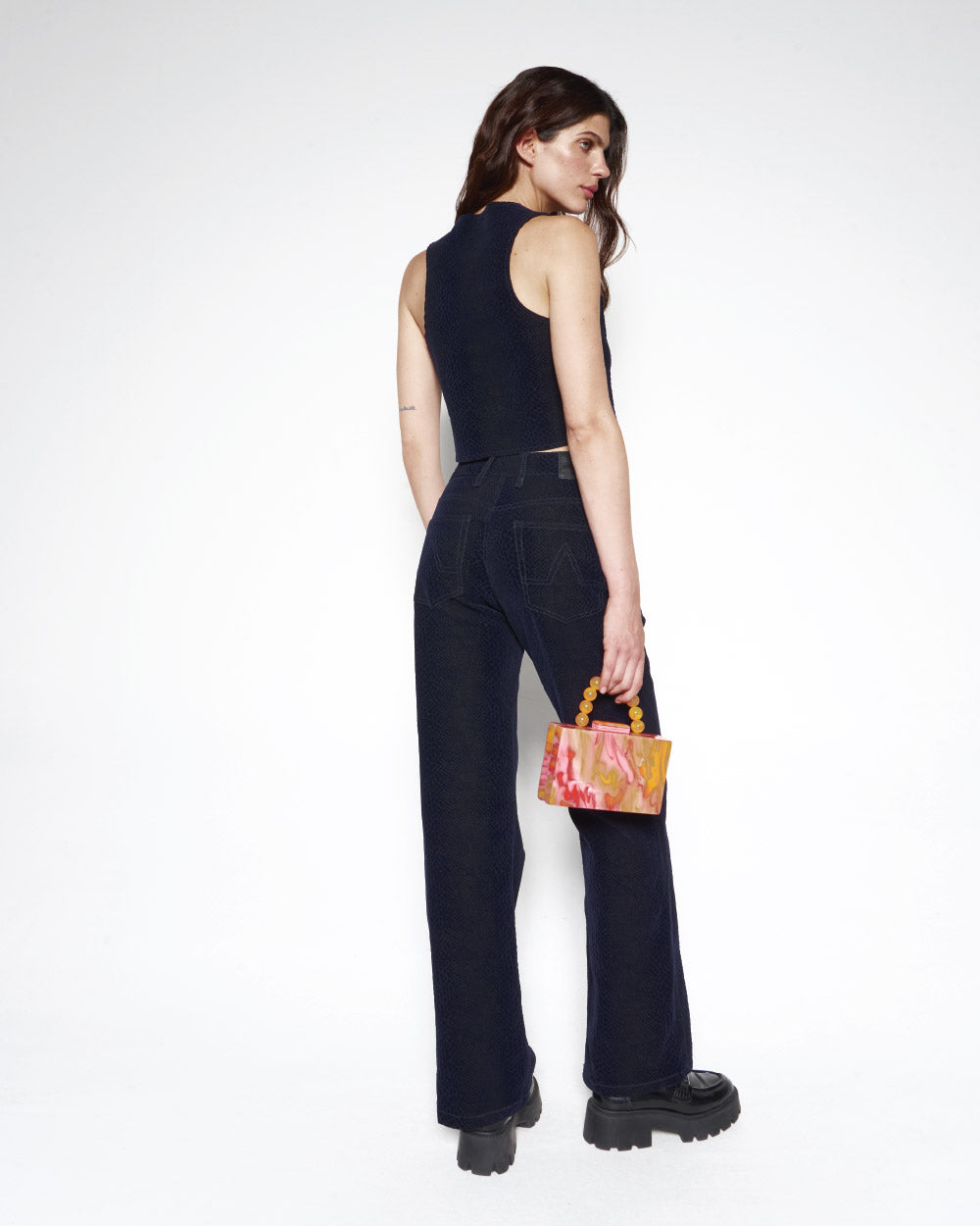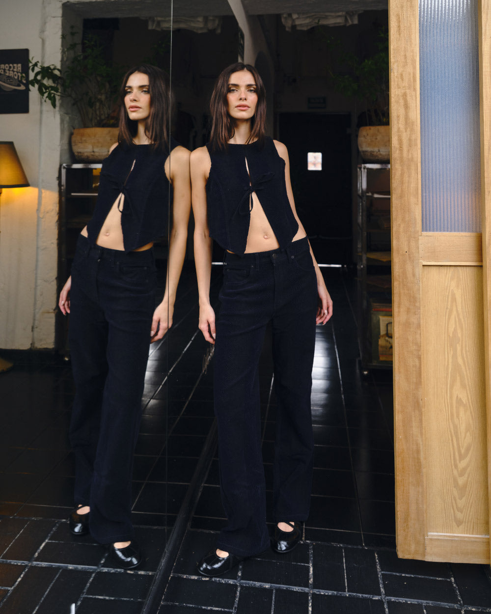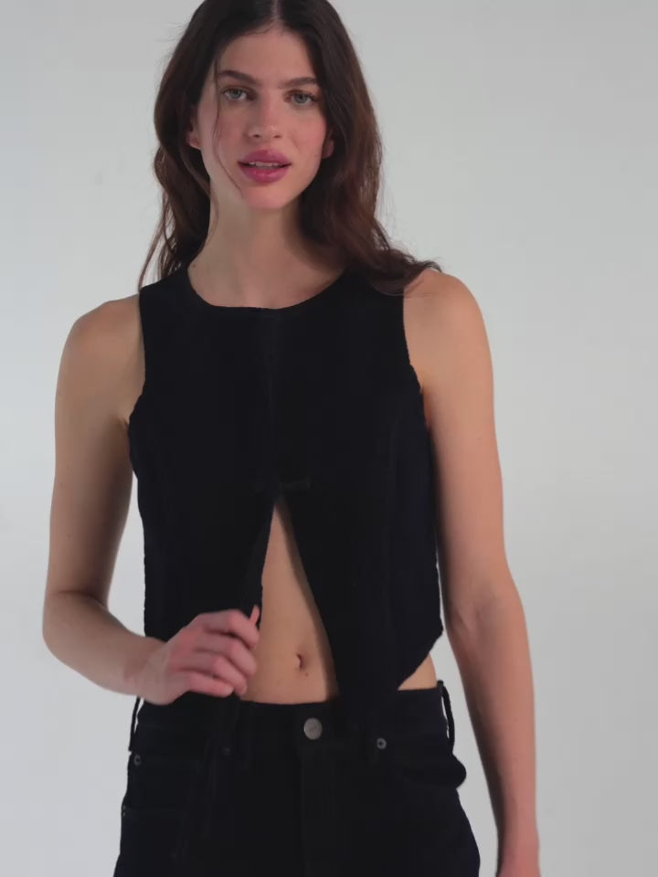 The quiet statement piece you love. Top con abertura frontal y ajuste en tiras, confeccionado en tela aterciopelada con textura de serpiente. Completa el set con los Roundup Pants.
