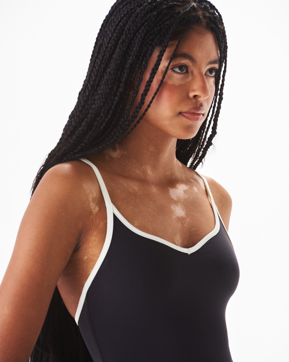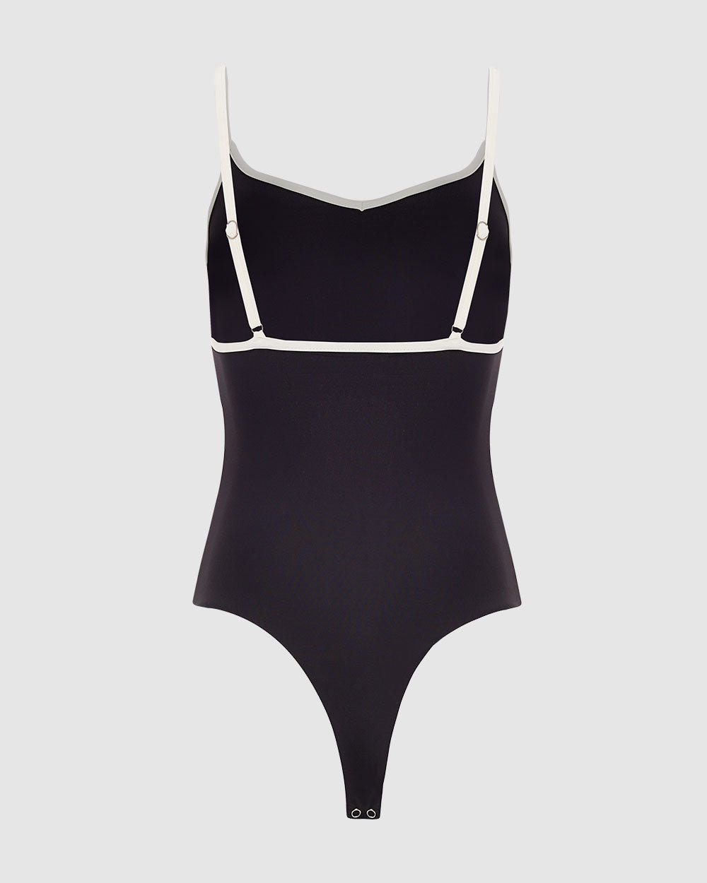 Flirty and comfy. Bodysuit con escote corazón, cargaderas ajustables y contraste en sesgos. Broches en entrepierna para regular.