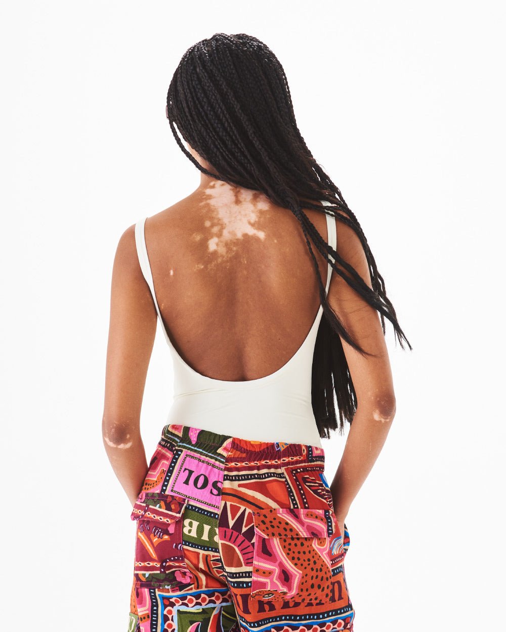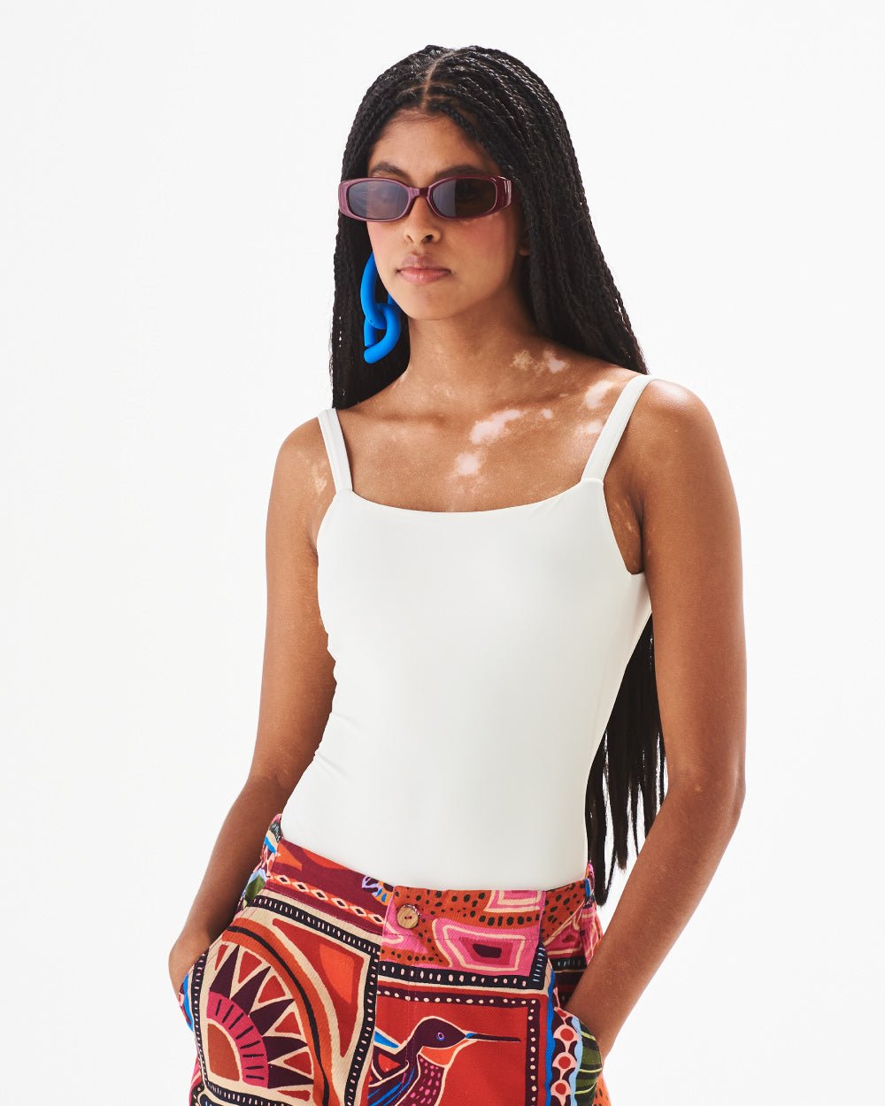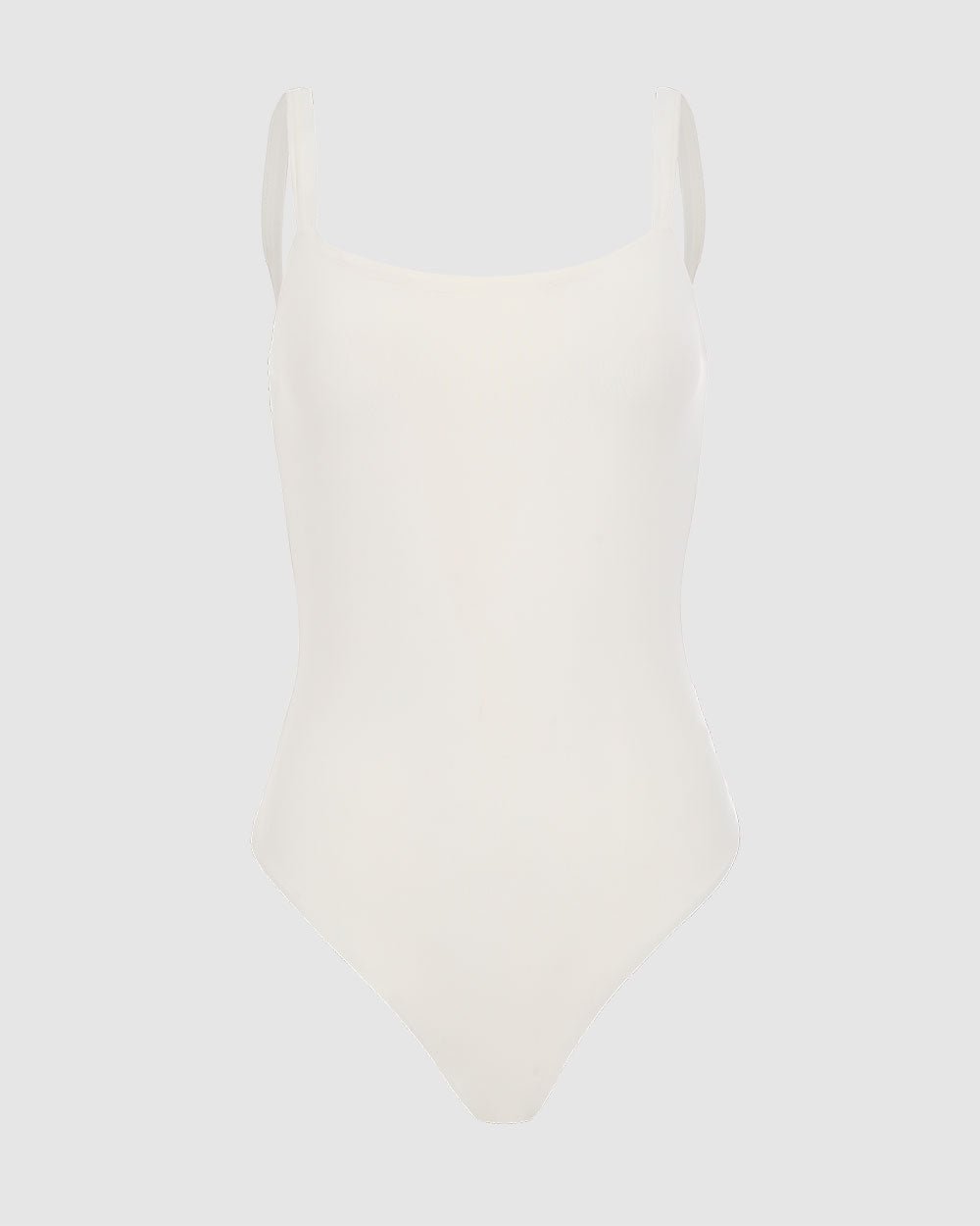 Chic with an athletic twist. Bodysuit deportivo, con broches, escote recto y espalda baja.