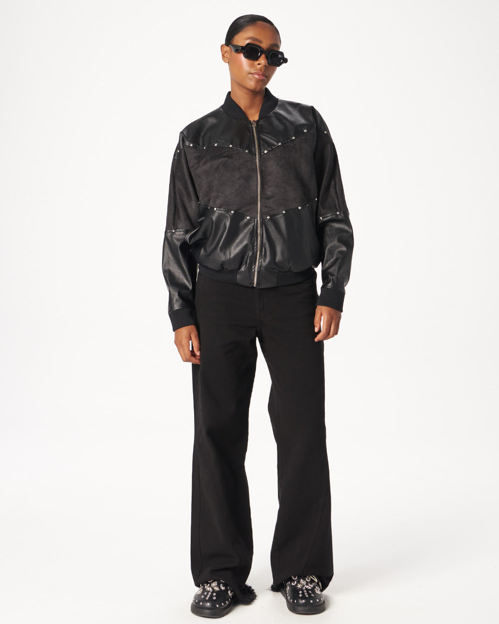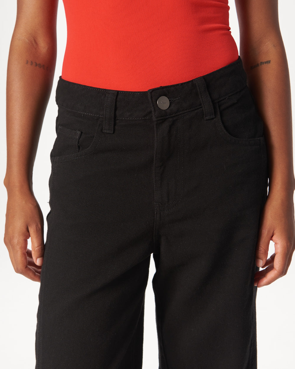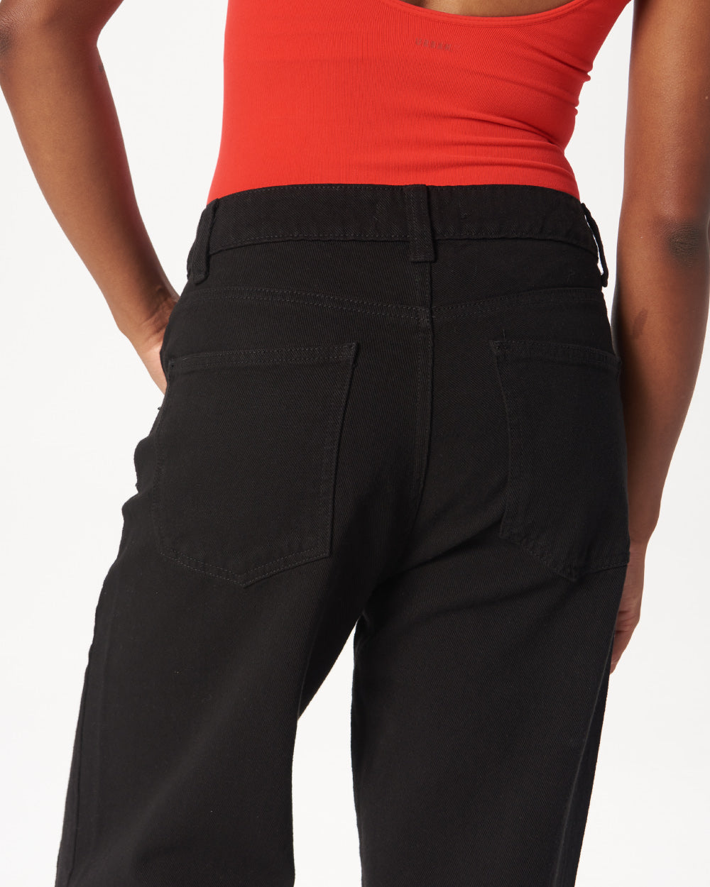Rebel with a cause Jean negro 100% denim de 5 bolsillos con silueta recta y detalles que marcan la diferencia costuras curvas en delantero y desgastes estratégicos Tiro medio para versatilidad de styling.
