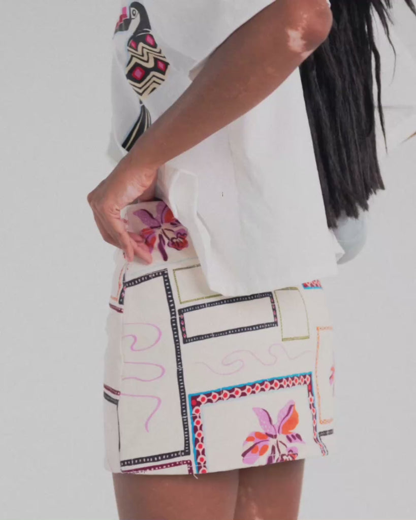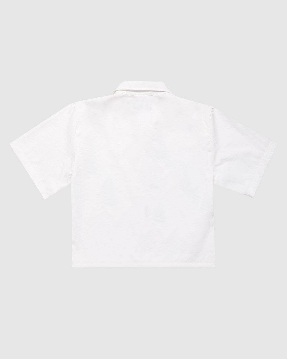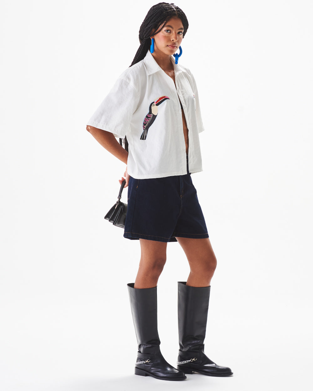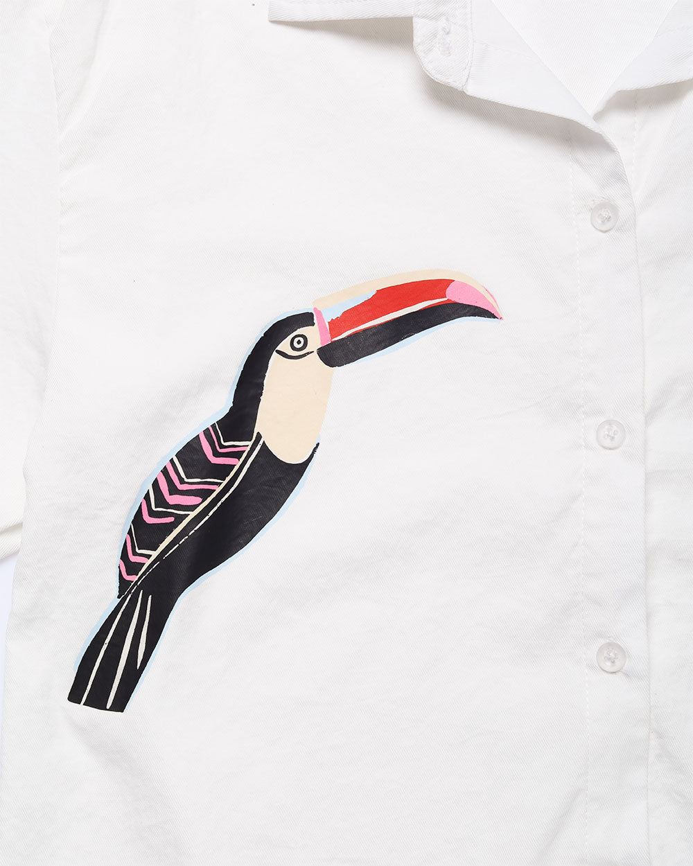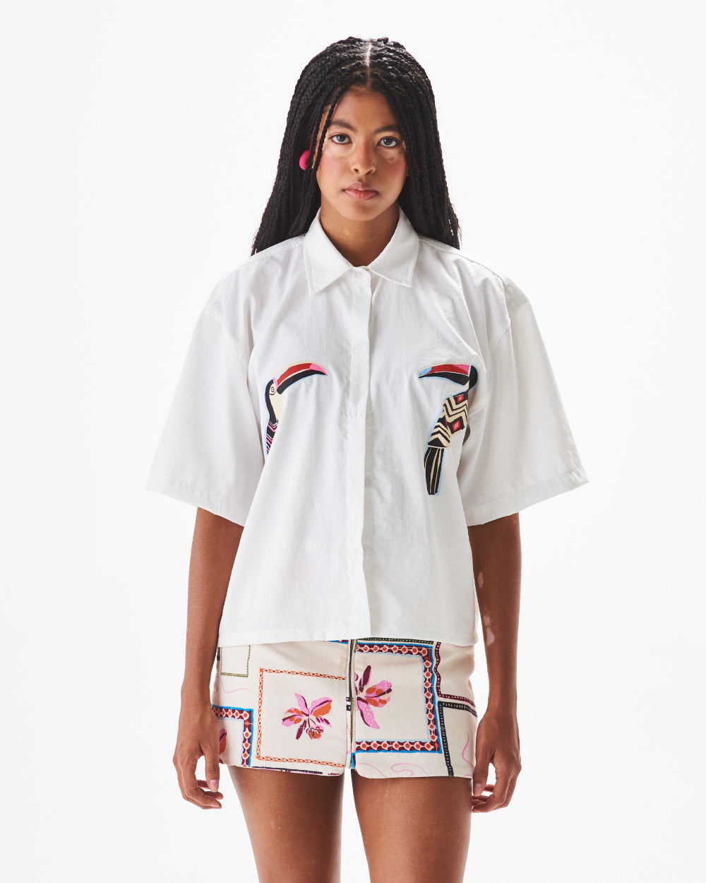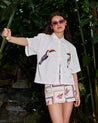 By-the-shore vibes. Boxy shirt con tucanes estampados en ambos frentes. Cuello con banda y mangas sobre codos.