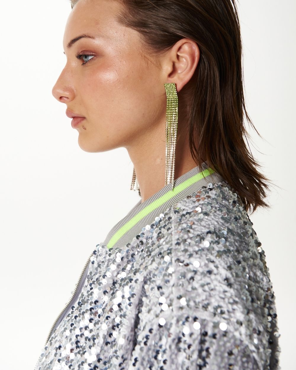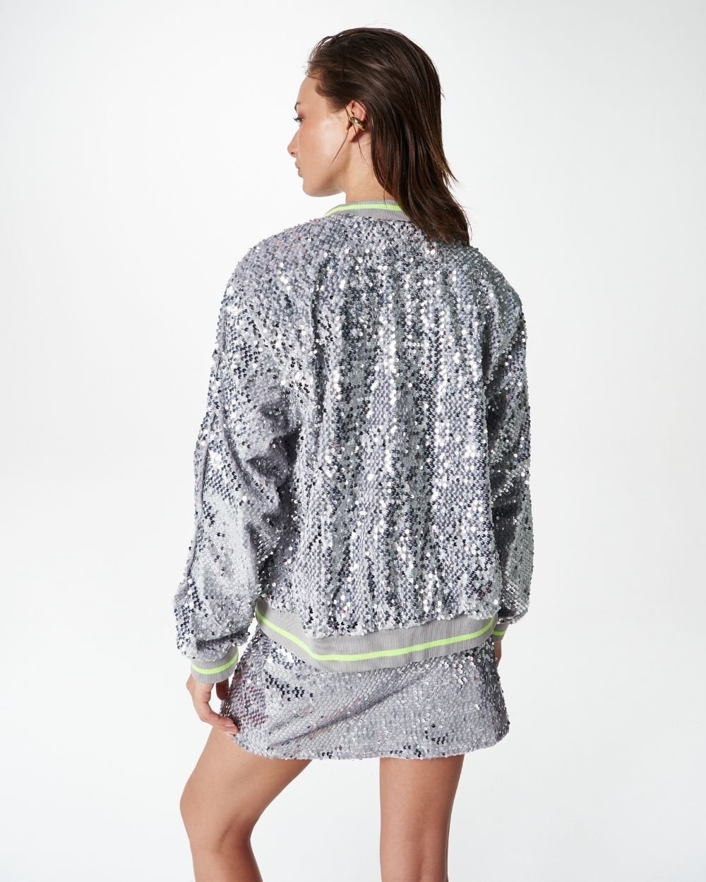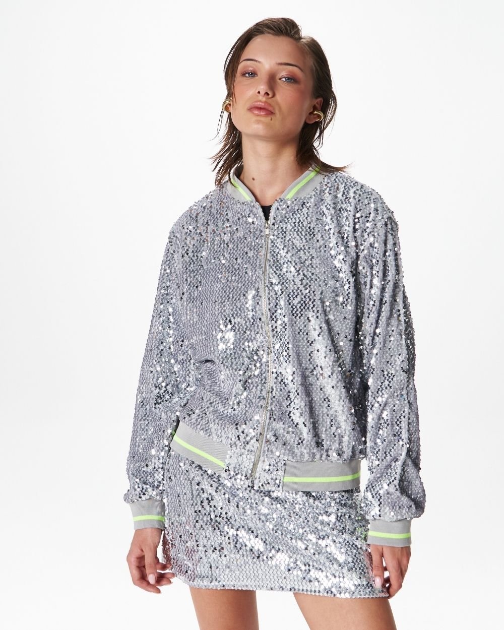 A subtle excess. Bomber jacket en tela velvet de lentejuelas, cuello, puño y pretina en rib, cierre separable y bolsillos laterales.