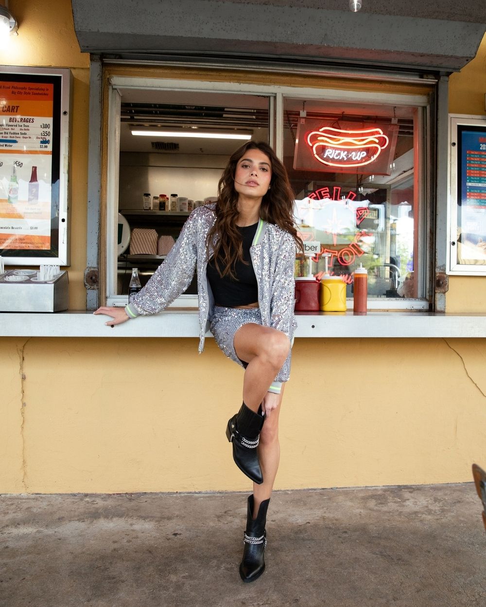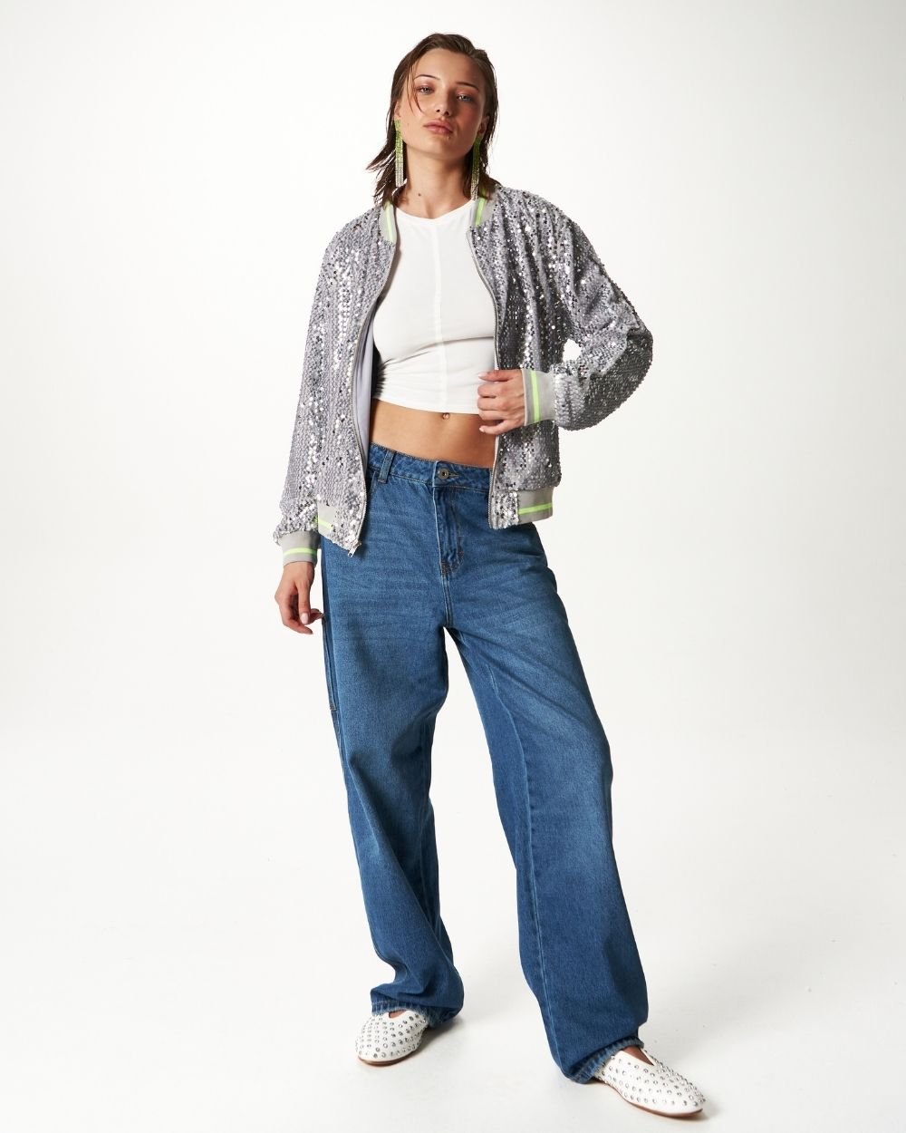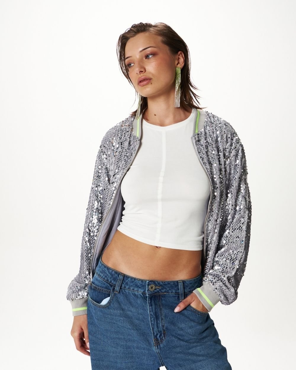 A subtle excess. Bomber jacket en tela velvet de lentejuelas, cuello, puño y pretina en rib, cierre separable y bolsillos laterales.