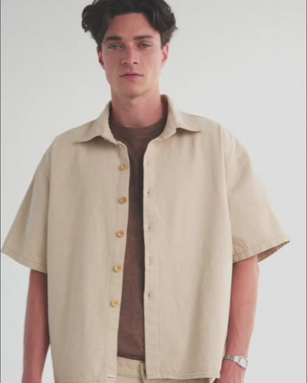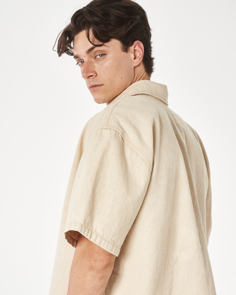 Overshirt de denim en color natural, bordado en posterior. Psst… grab the full set.
