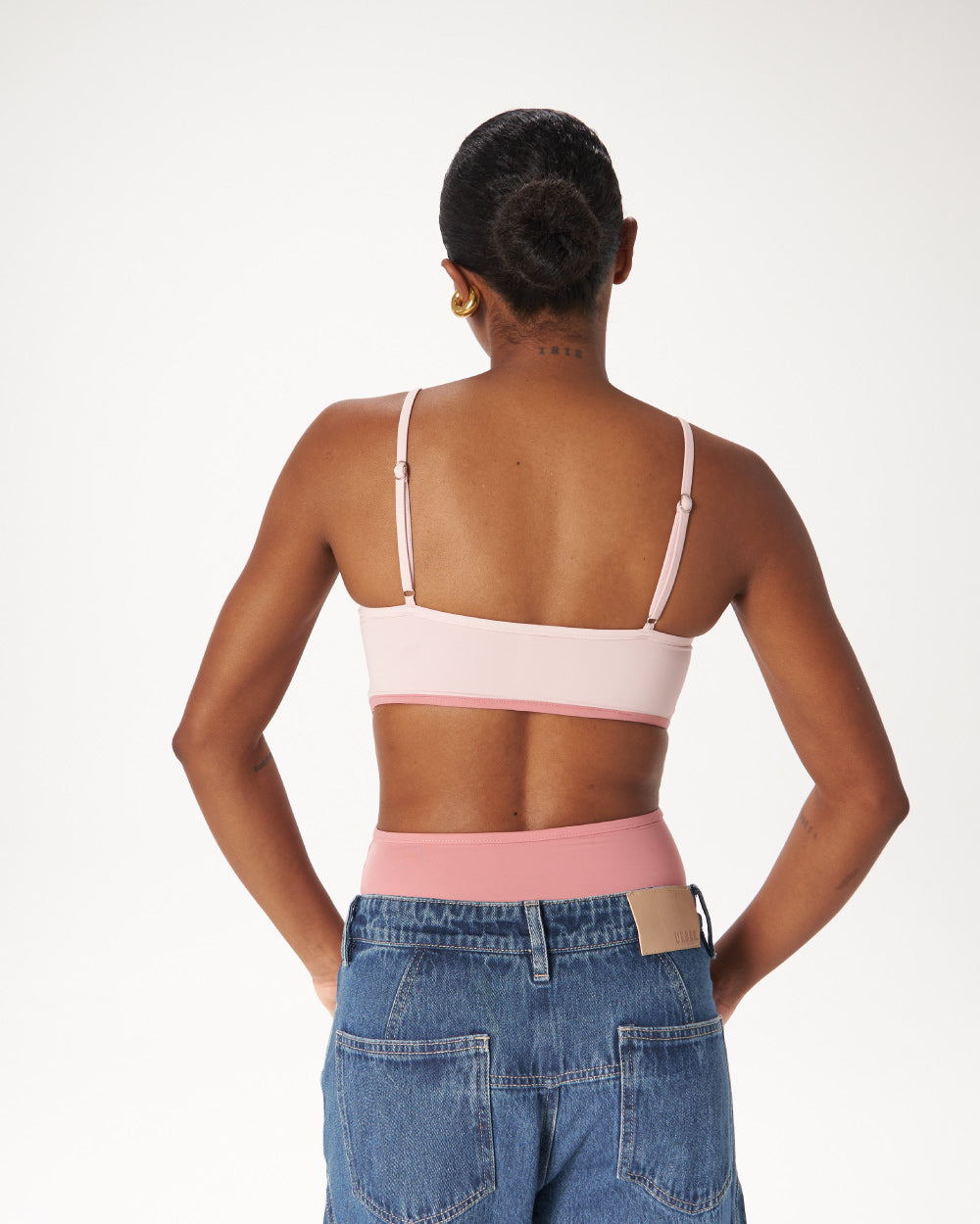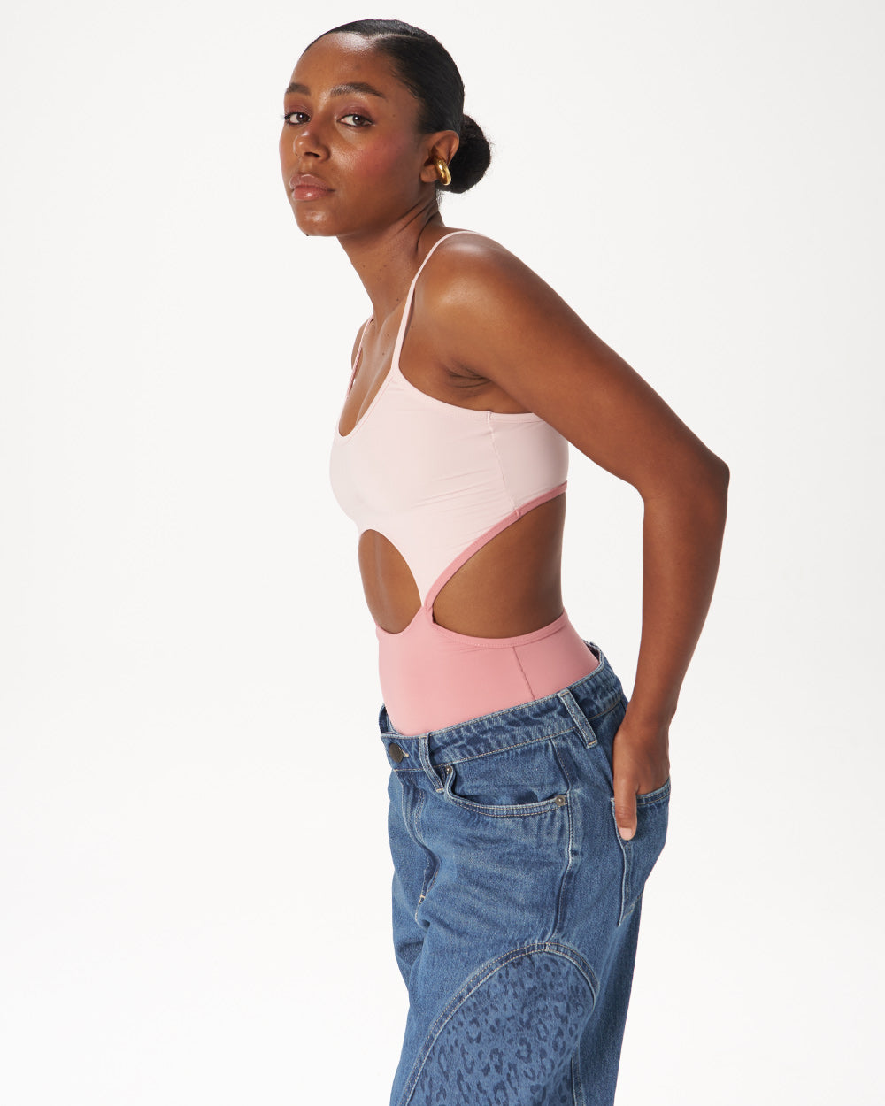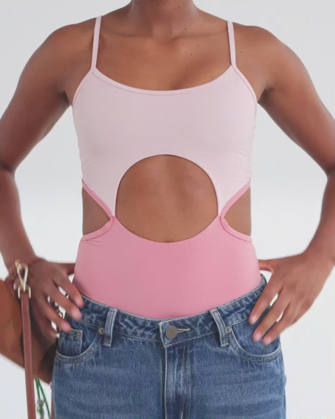 A statement take on the classic bodysuit. Con cargaderas ajustables, cutout en frante y espalda y contraste de color en dos tonos de rosa.