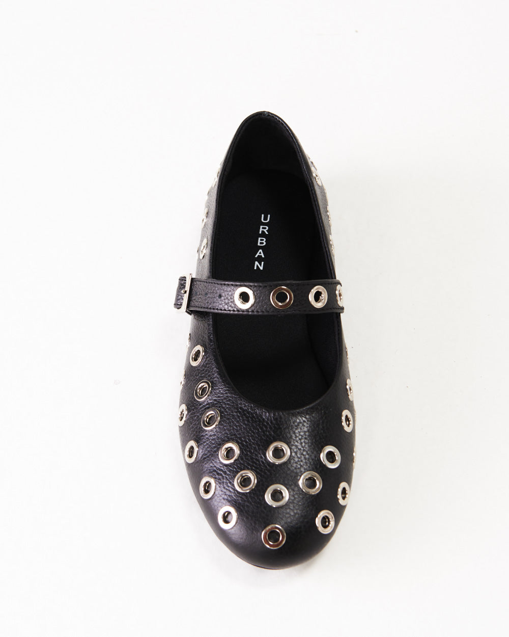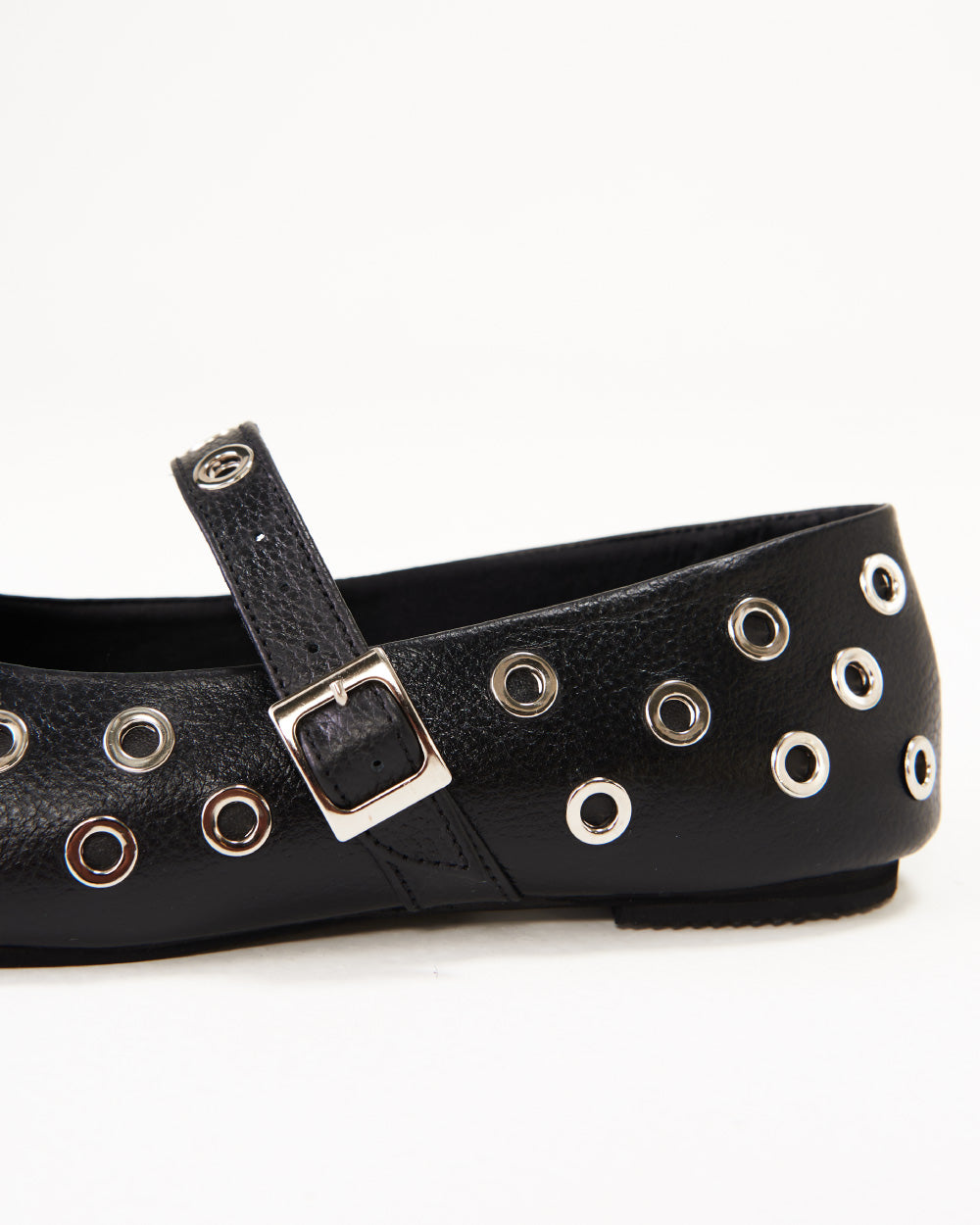 Slip-on ballerinas (para poner y quitar fácilmente), capelladas en cuero, punta redonda, empeine con una correa y hebillas ajustables, con detalles de taches.