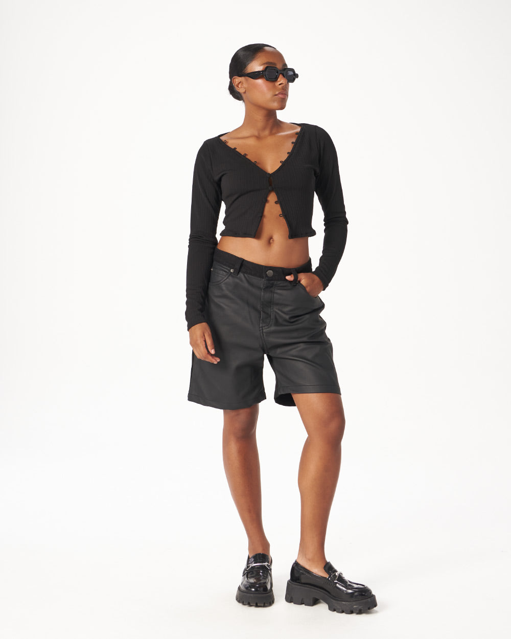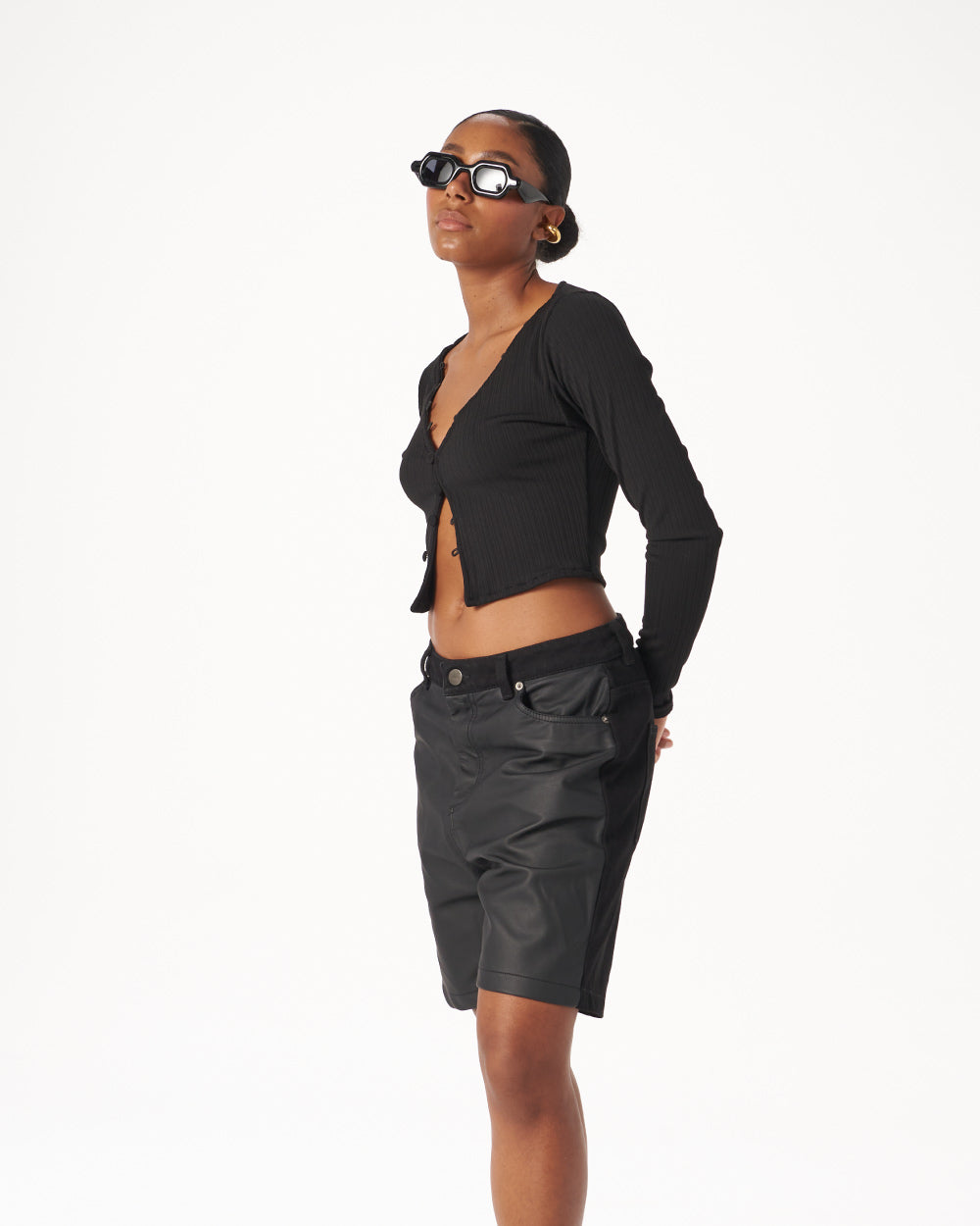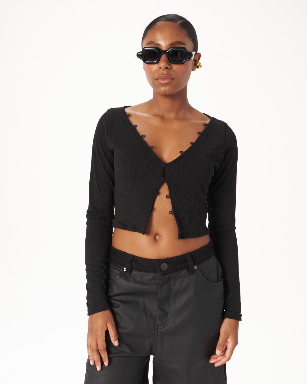 Just your regular hot girl sweater top. Silueta ajustada, cuello bandeja, cierre con botones forrados y orejitas en elástico que suben hasta escote en ambos lados; elaborado en tela con textura acanalada.
