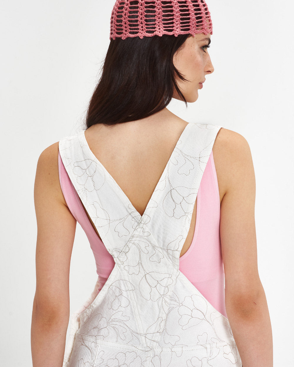 con tirantes ajustables, bolsillos delanteros y traseros y cierre de botones en el lateral.