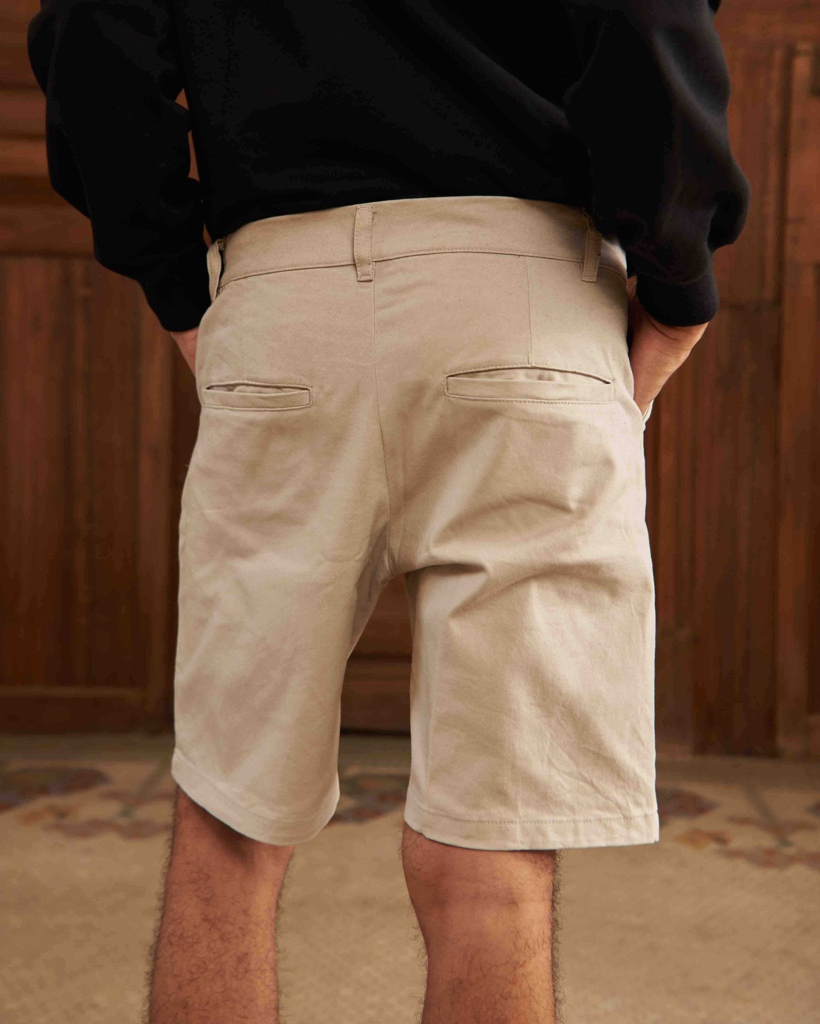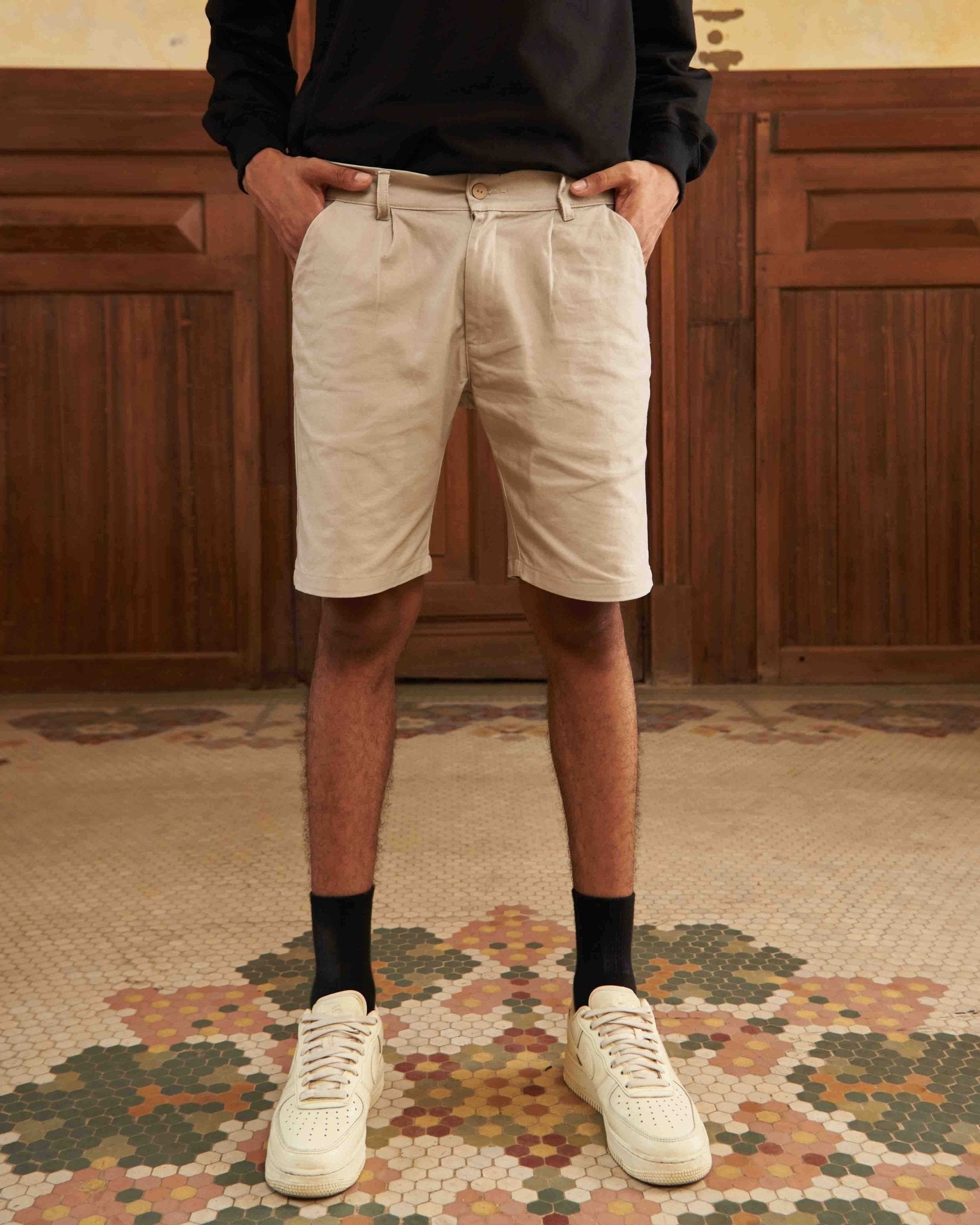 Short clásico bota recta con prenses en pretina y largo sobre rodilla.