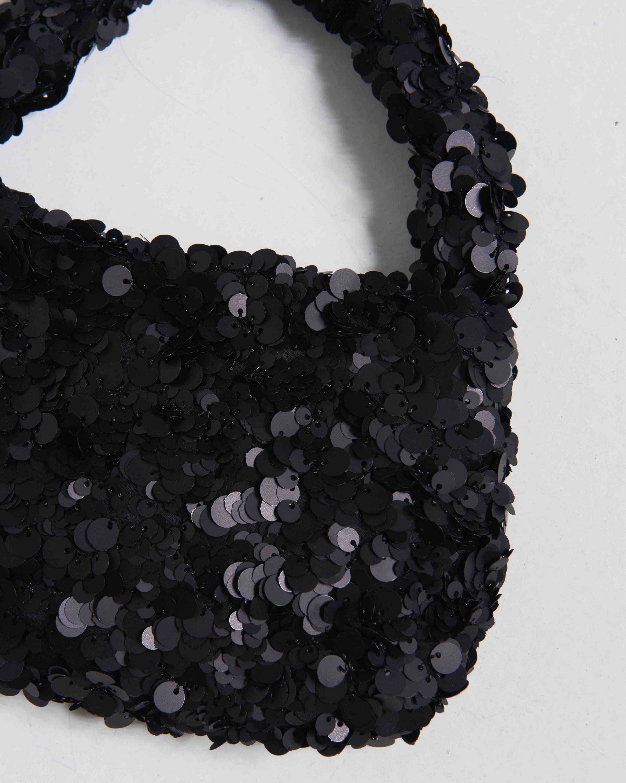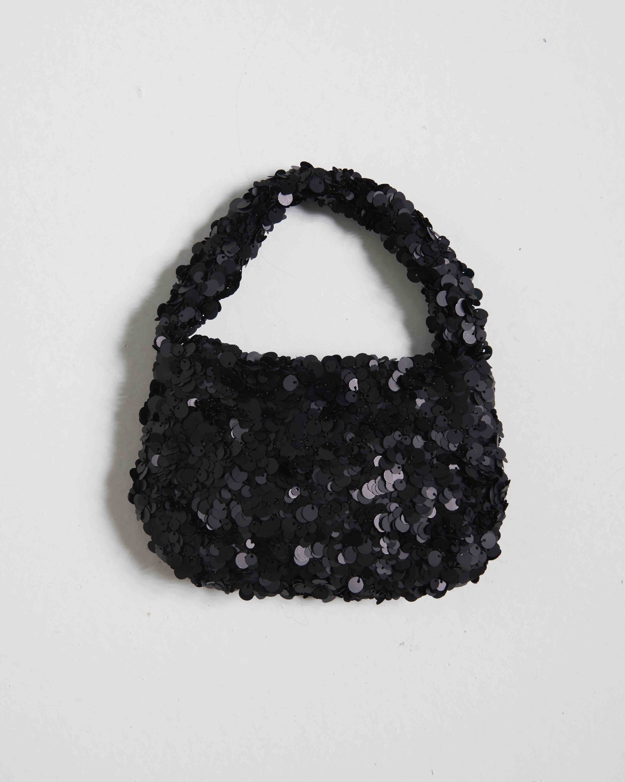 Right bag, every time. Bolso de mano de silueta redondeada, con acabado en lentejuelas negras, asa corta integrada y cierre con broche magnético.