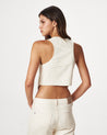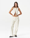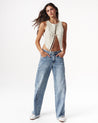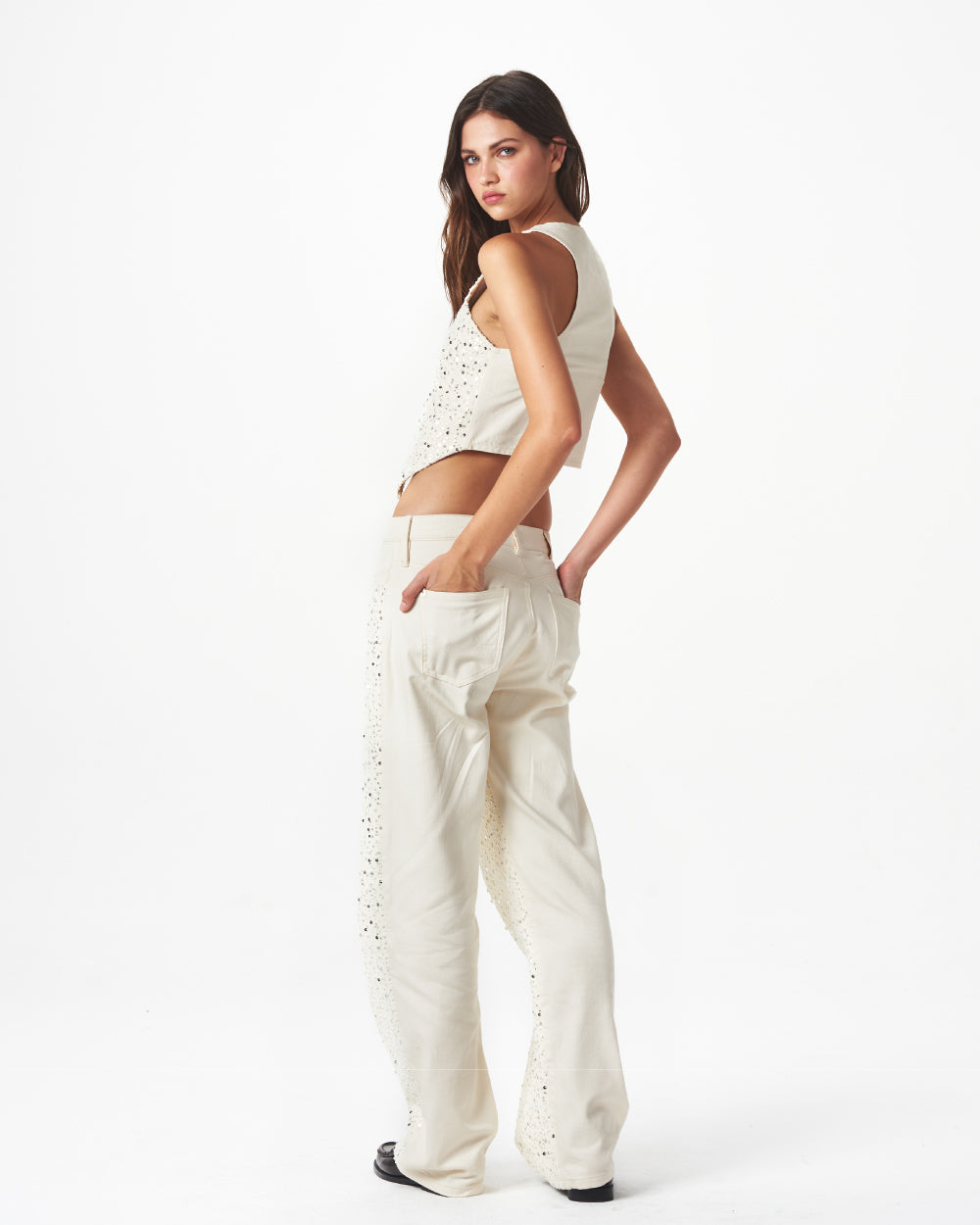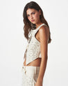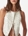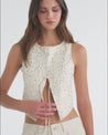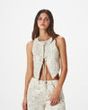 Shine, but keep it casual. Top tipo chaleco, en mezcla de bases. Frente cerrado hasta escote y cordón para anudar en adelante. Frente en punta más largo que el posterior. Style tip: Shop the full set.